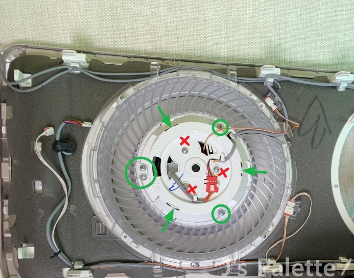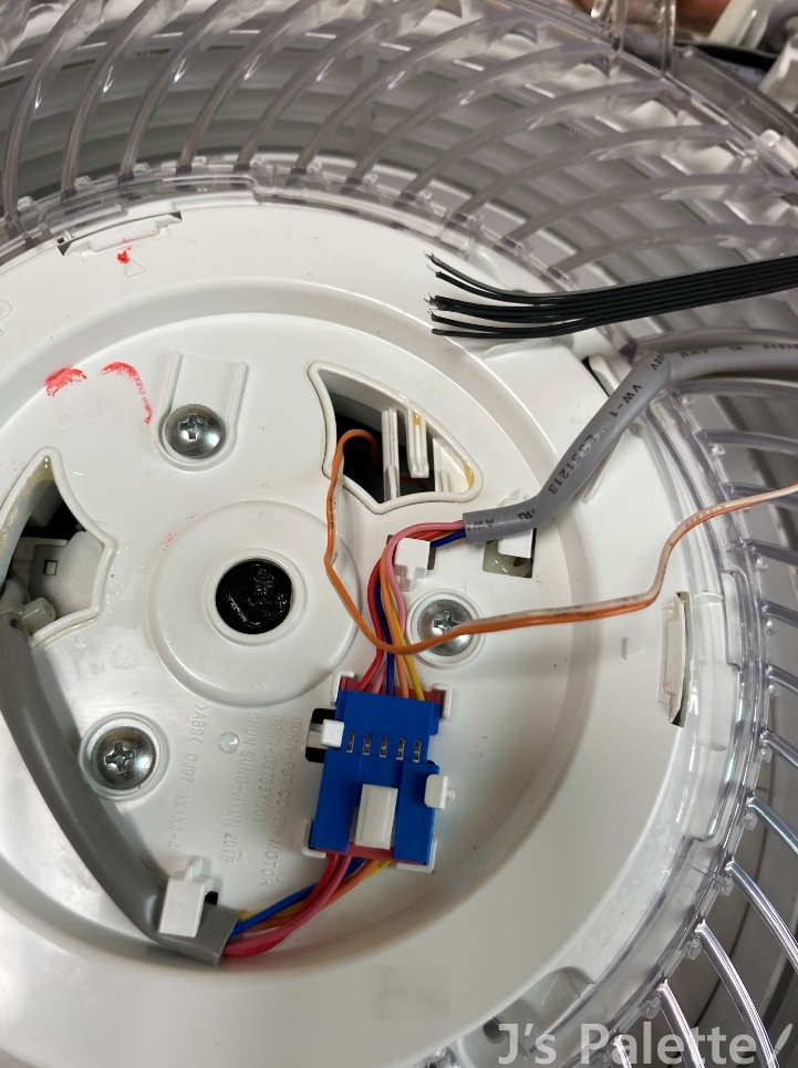 빨간X 부분의 나사를 잘못 풀면 내부에서 모터만 툭 떨어지므로 풀지 않도록..